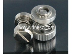 彈簧螺釘由四個部分組成:1.螺釘部分,按材質分可用碳鋼和不銹鋼生產,為了方便安裝頭部一般做成一字或十字的,螺釘部分主要起與零件連接的作用。2.手擰套,一般是鋁制的,表面要拉直紋花,表面可以做成本色的,也可以做成氧化黑色或陽極處理成彩色。3.壓鉚套,一般是碳鋼或不銹鋼,它的作用主要起與鈑金連接作用。4.彈簧,主要起螺釘的伸縮作用。